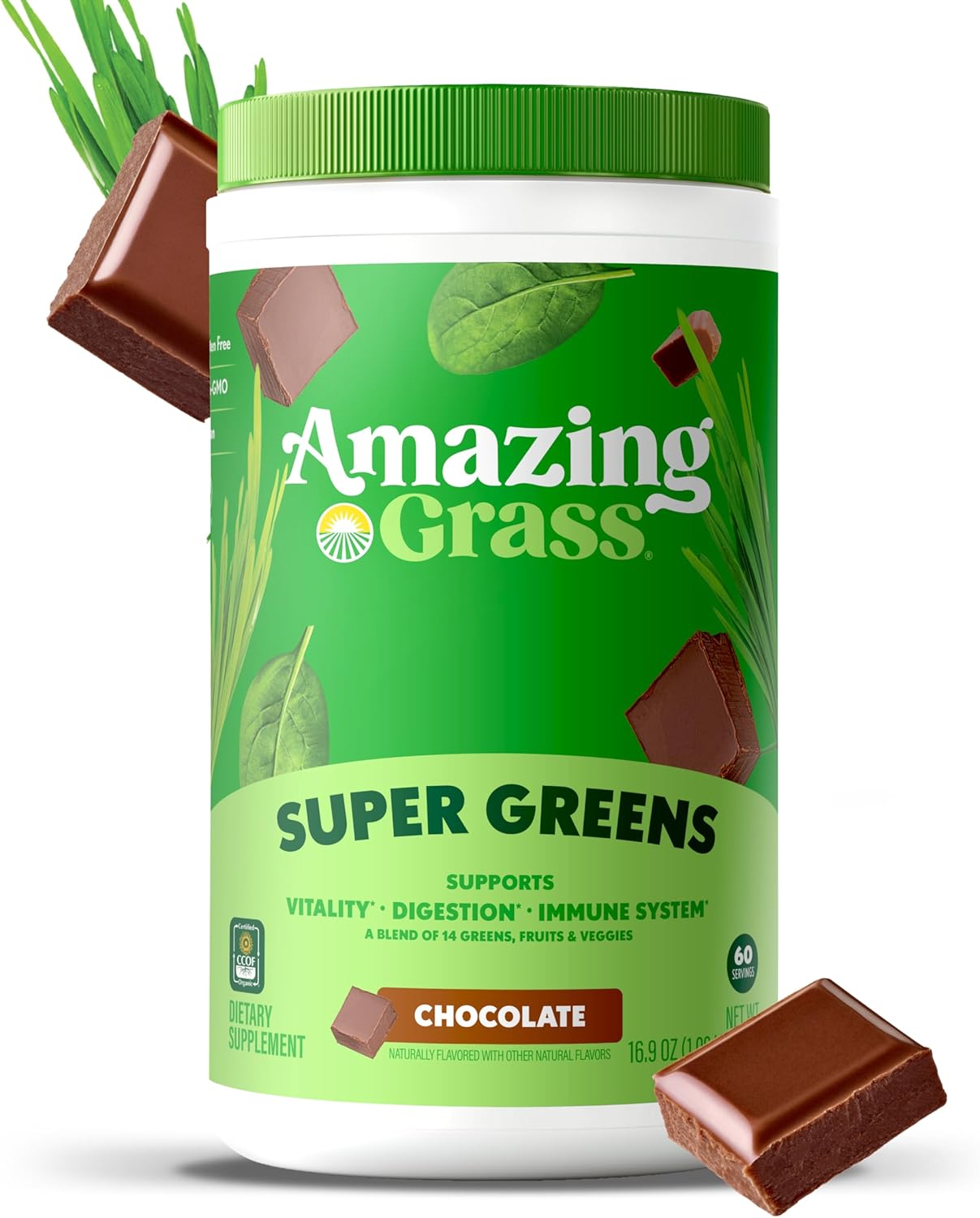 Amazing Grass Greens Superfood Powder: Greens Powder with Digestive Enzymes & Probiotics, Organic Spirulina, Chlorella, and Beet Root Powder, Chocolate, 60 Servings