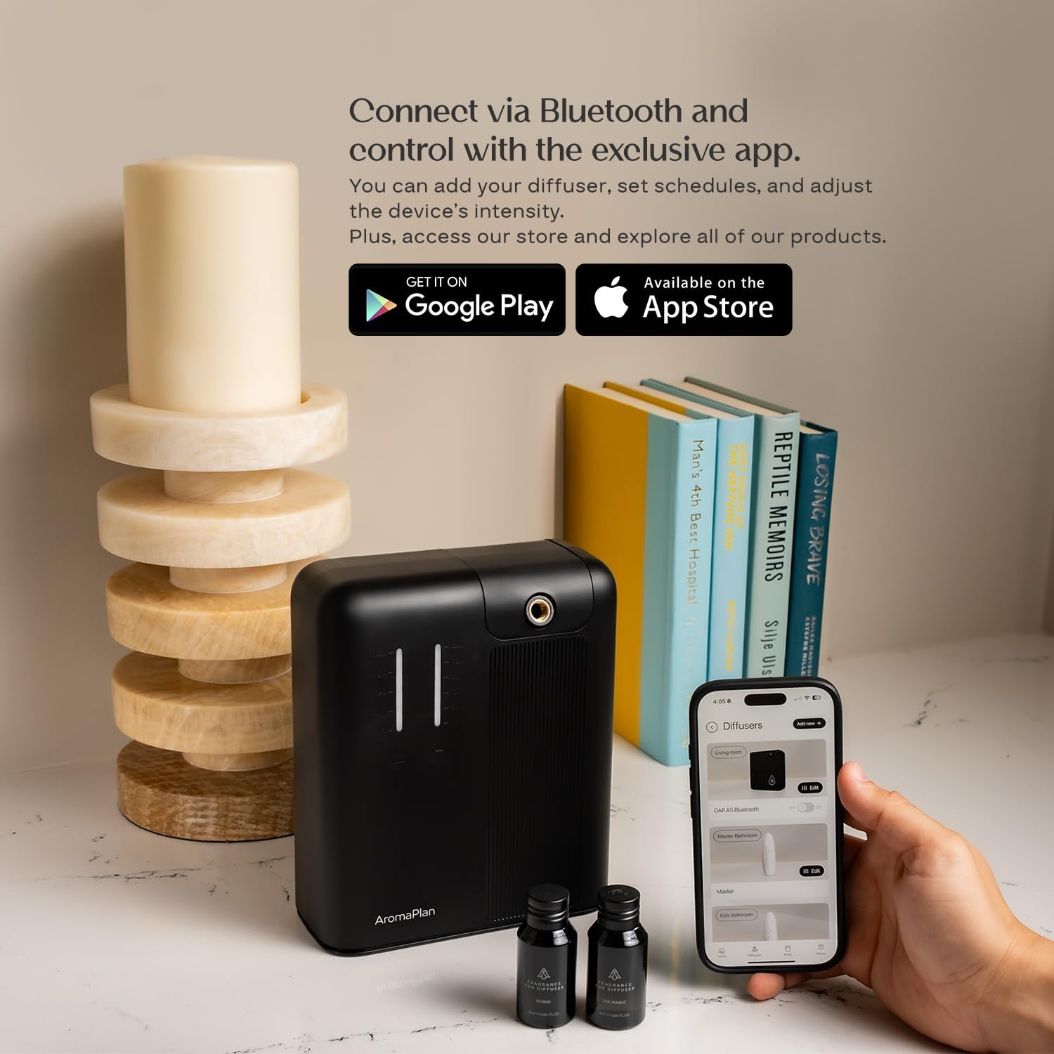 The app is called AromaPlan. It’s black and white, available on the Apple App Store (iOS) and Google Play Store (Android). Once installed, you can easily connect your diffuser and control its settings from your smartphone.