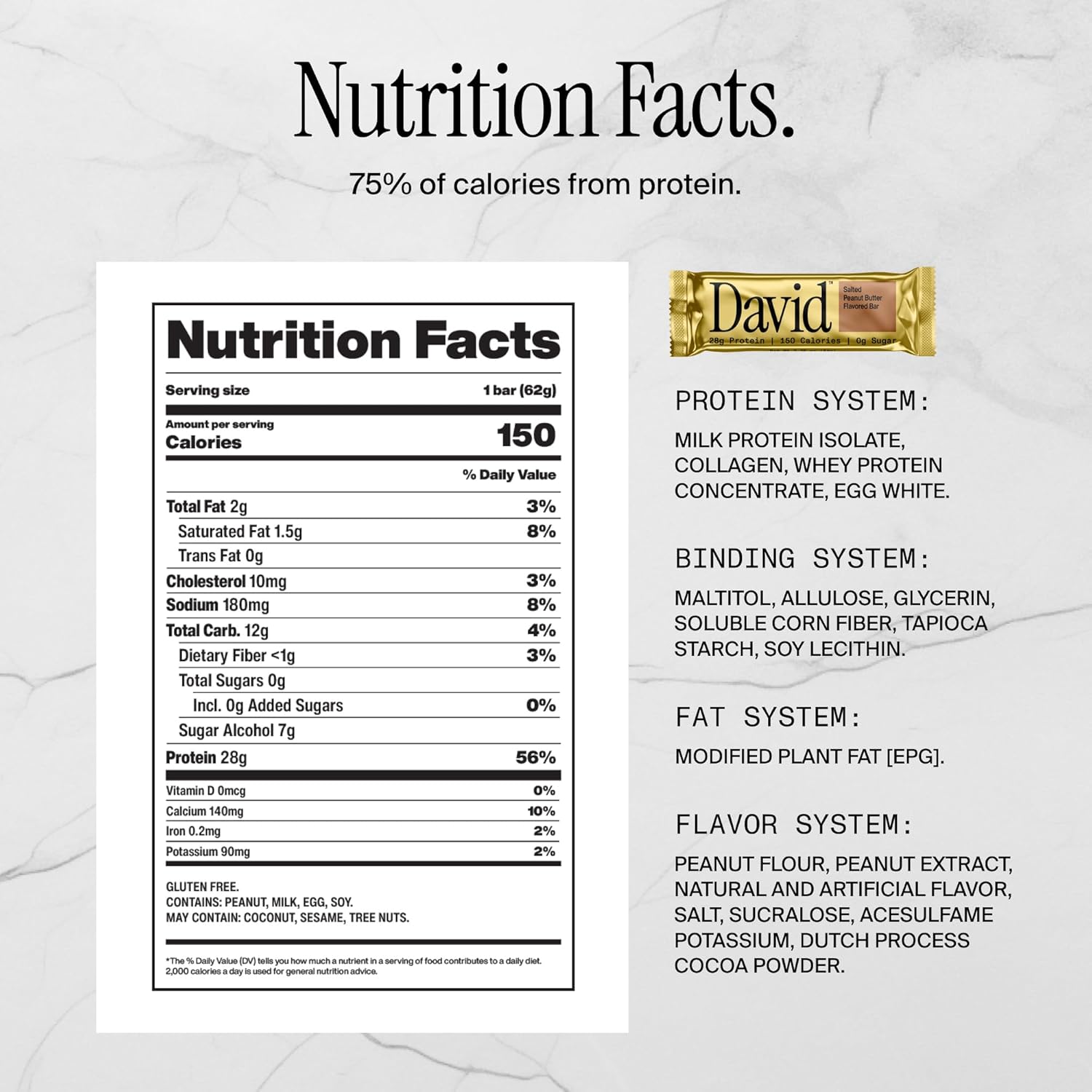 DELICIOUS FLAVOR OPTIONS – Salted Peanut Butter David protein bar is sweet, salty, & smooth, filled with creamy peanut chunks and roasted peanut crisps. With the David Flavor System, you get all the sweetness without added sugar. These low carb protein bars have a creamy texture with added crunchy crisps. Key components of the flavor system are cocoa powder, natural & artificial flavors, salt, sucralose, & acesulfame potassium.