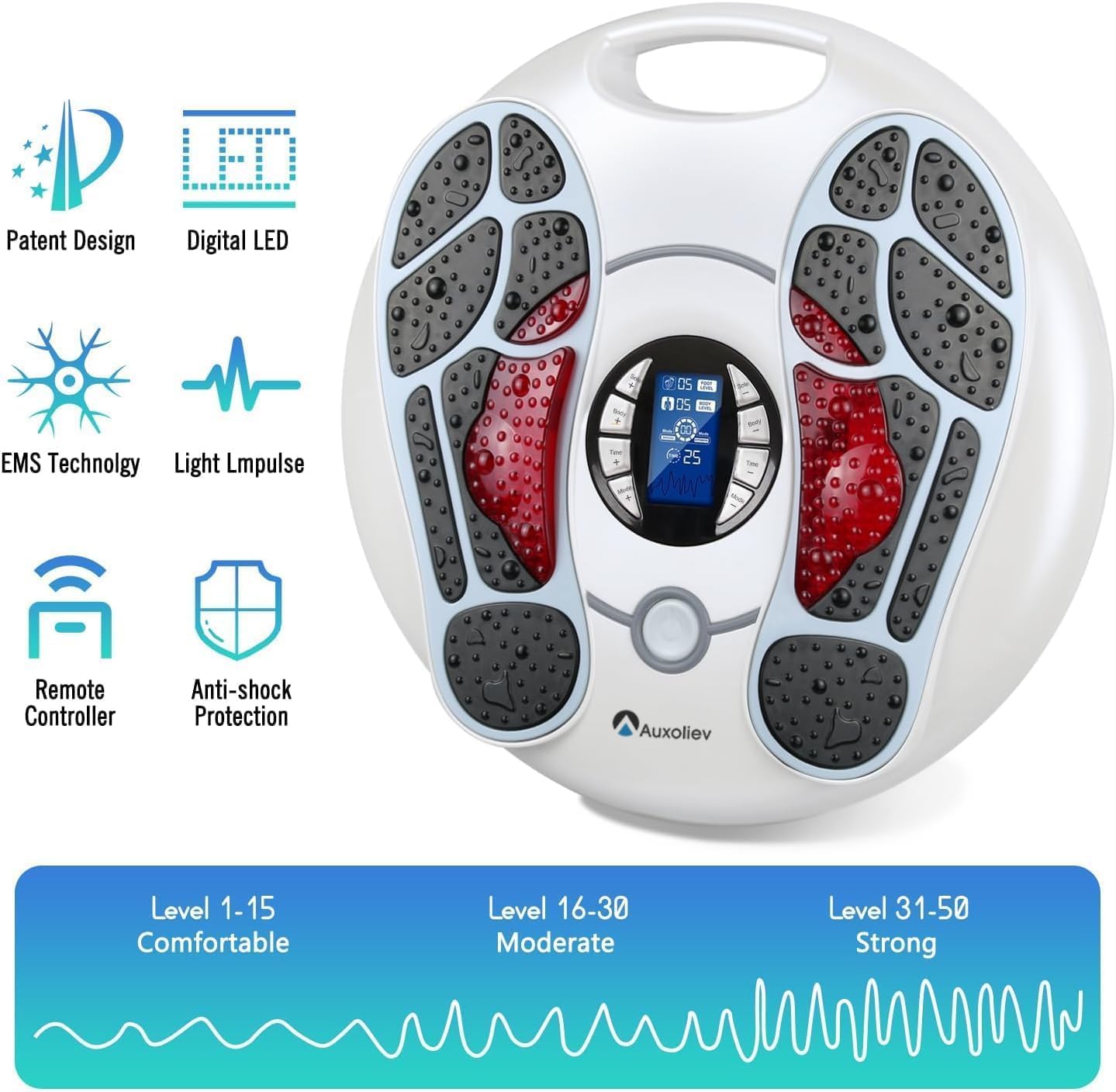 Multiple modes adjustable : Our foot massager has 25 operation modes, which can give certain electrical pulse through 4 pcs of electrode pads placed on the skin and 2 big electrode pads in Electrode Silicon Area for feet placed on the main unit