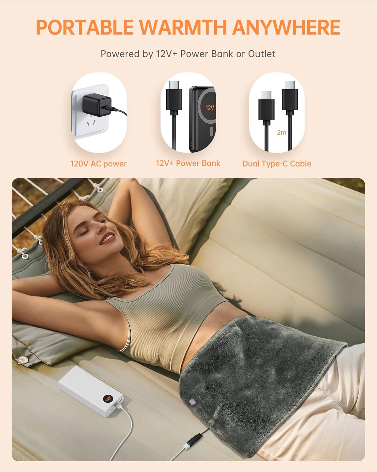 Jartoo carbon nano heating pad supports Type-C power, working with 12V+ power banks, US AC 120V voltage, and car power sources. Whether at home, in the office, in your car, or on camping trips, you can stay warm anytime, anywhere!