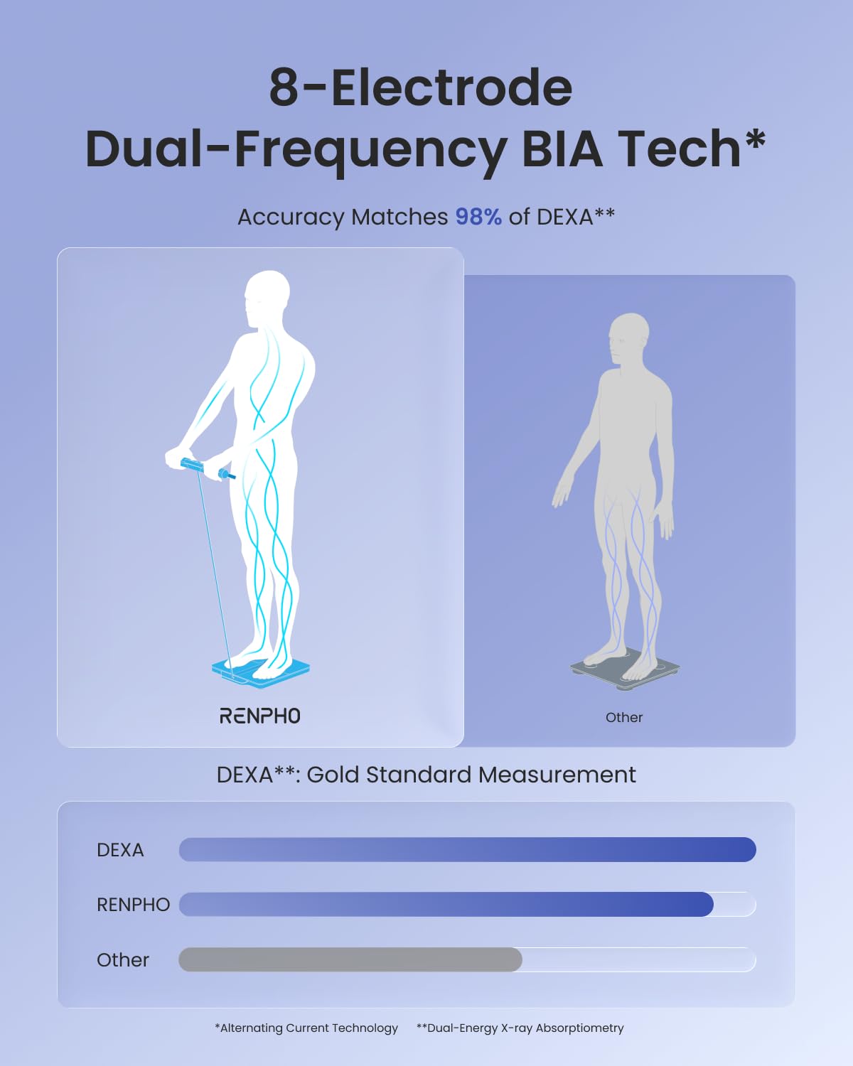 Precision in Measurement: Equipped with eight-electrode dual-frequency and segmental BIA technology, the RENPHO MorphoScan Nova smart scale delivers an accurate health overview (correlates to DEXA data with a correlation coefficient of ≥0.98)